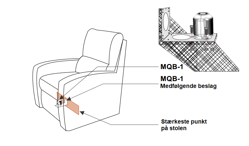 Lænestols montering er oplagt, og har du et godt stærkt bræt eller plade i konstruktionen af sofaen er det oplagt at spænde den fast der. Her kan det tit være nødvendigt at montere et bræt selv for at det skal blive stærkt nok. Og er der ikke plads til den kan stå oprejst er der et beslag der kan tilkøbes.